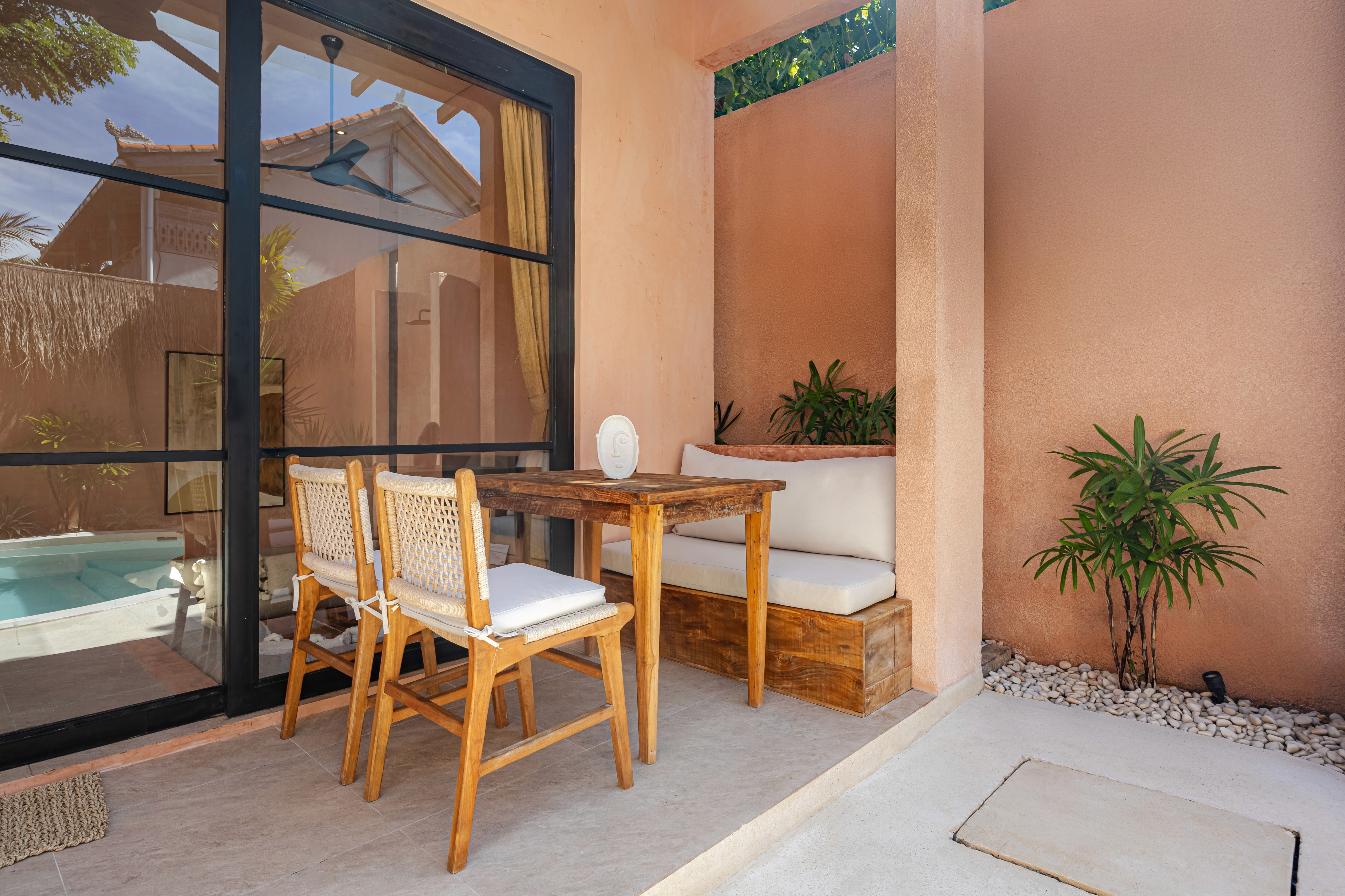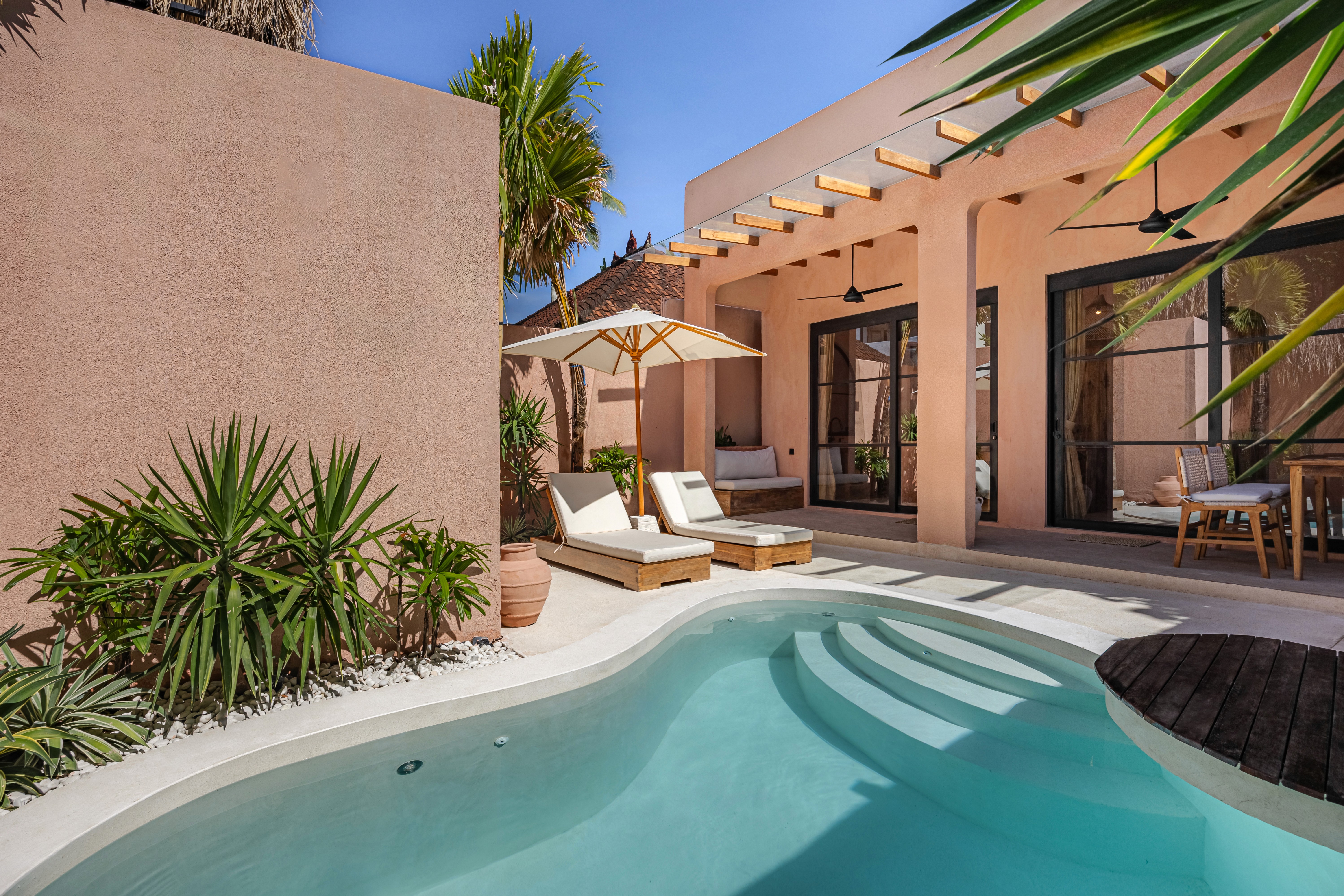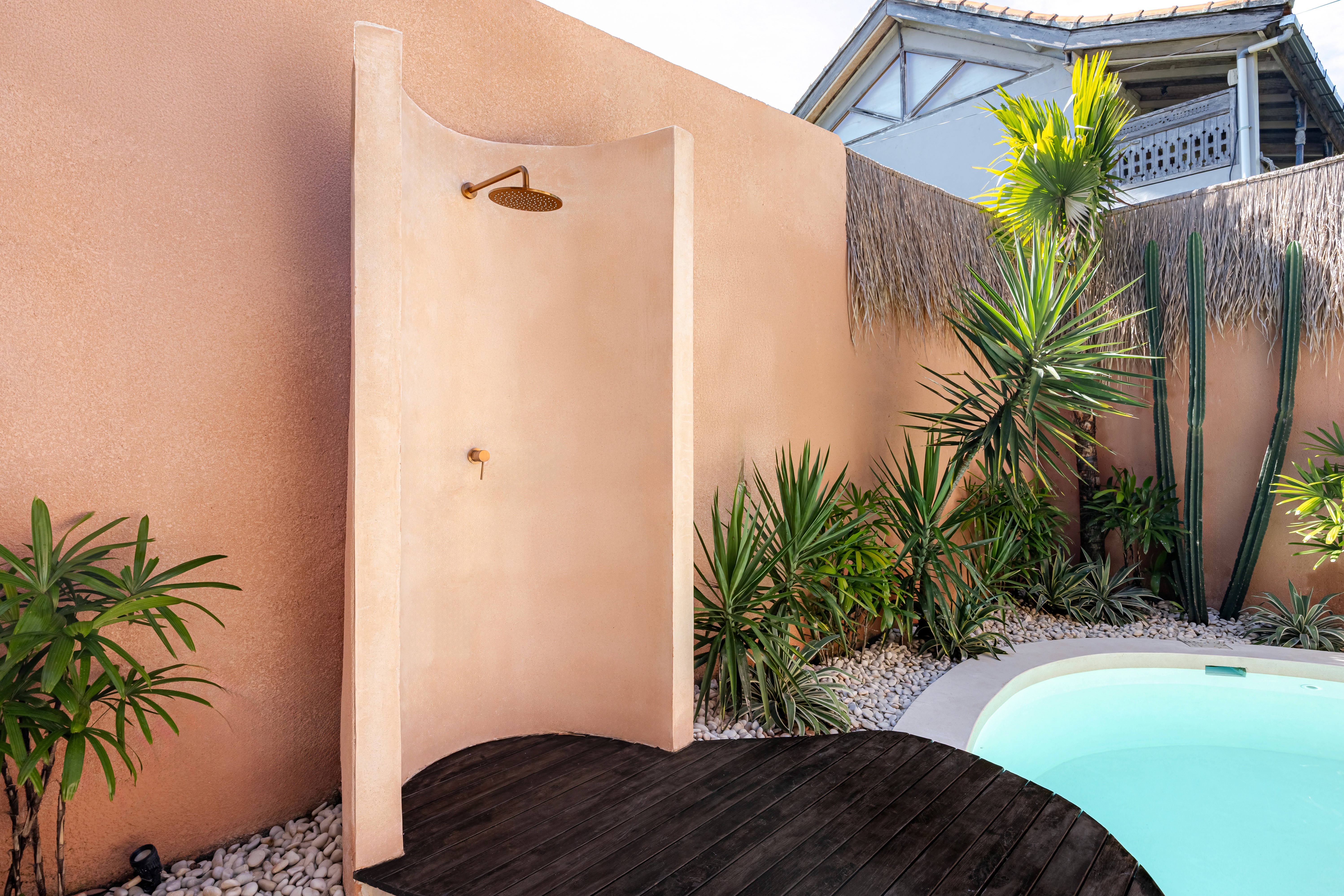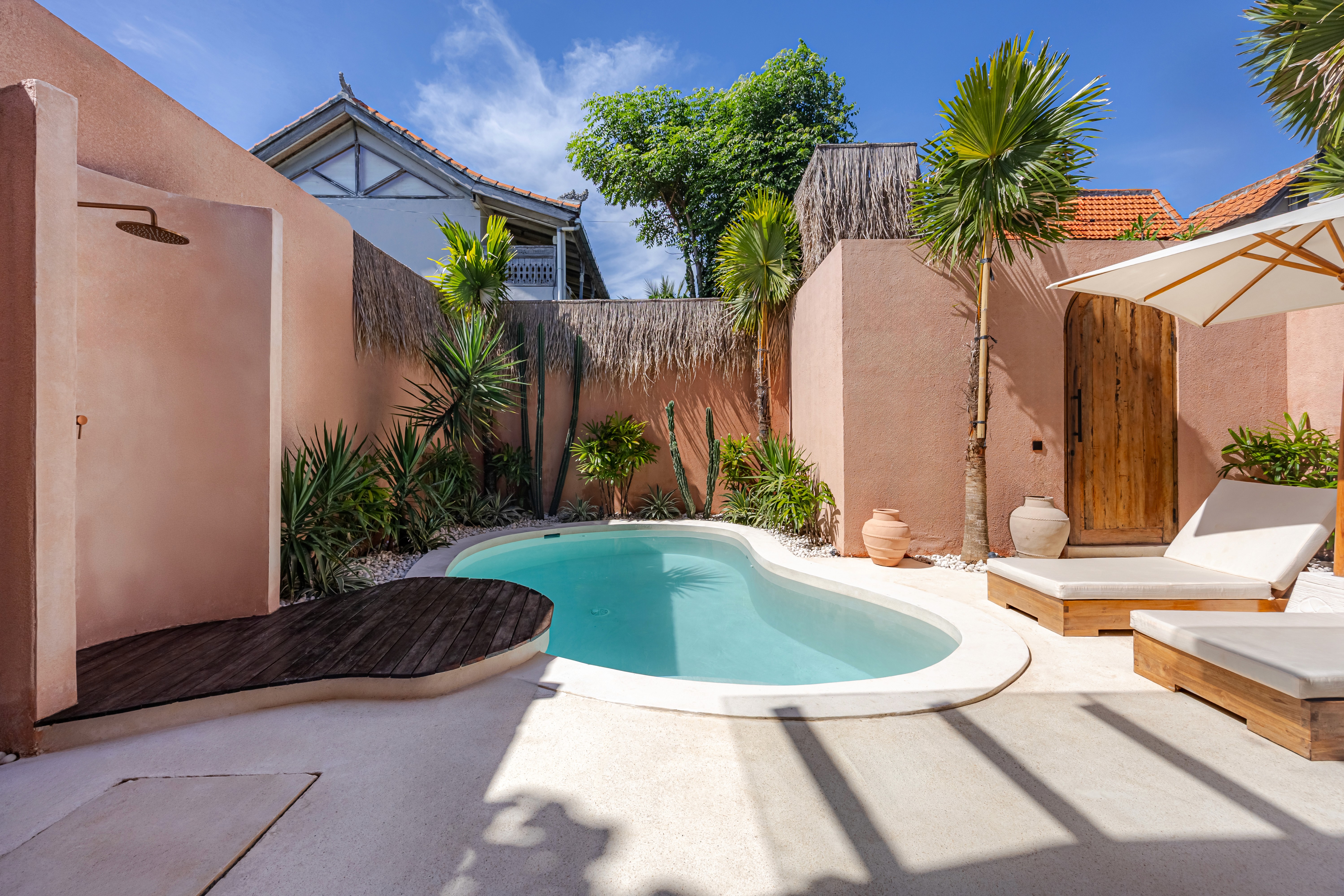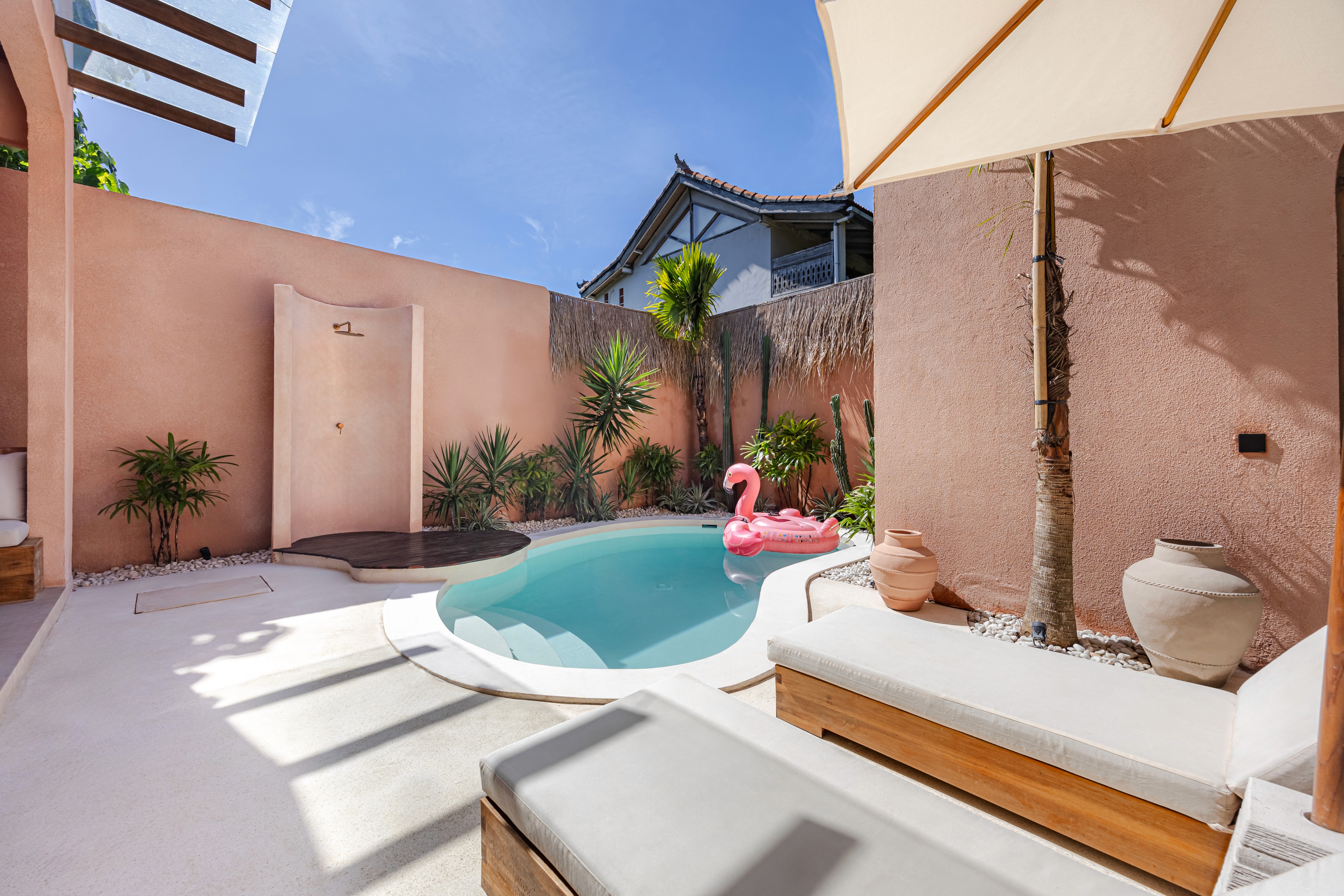The villa's walls are painted in the warm, inviting hues of a ripe papaya, creating a seamless blend with the island’s lush surroundings. A true architectural gem, the villa’s most unique feature is its papaya-shaped pool, a one-of-a-kind design that adds a playful and organic touch to the space.