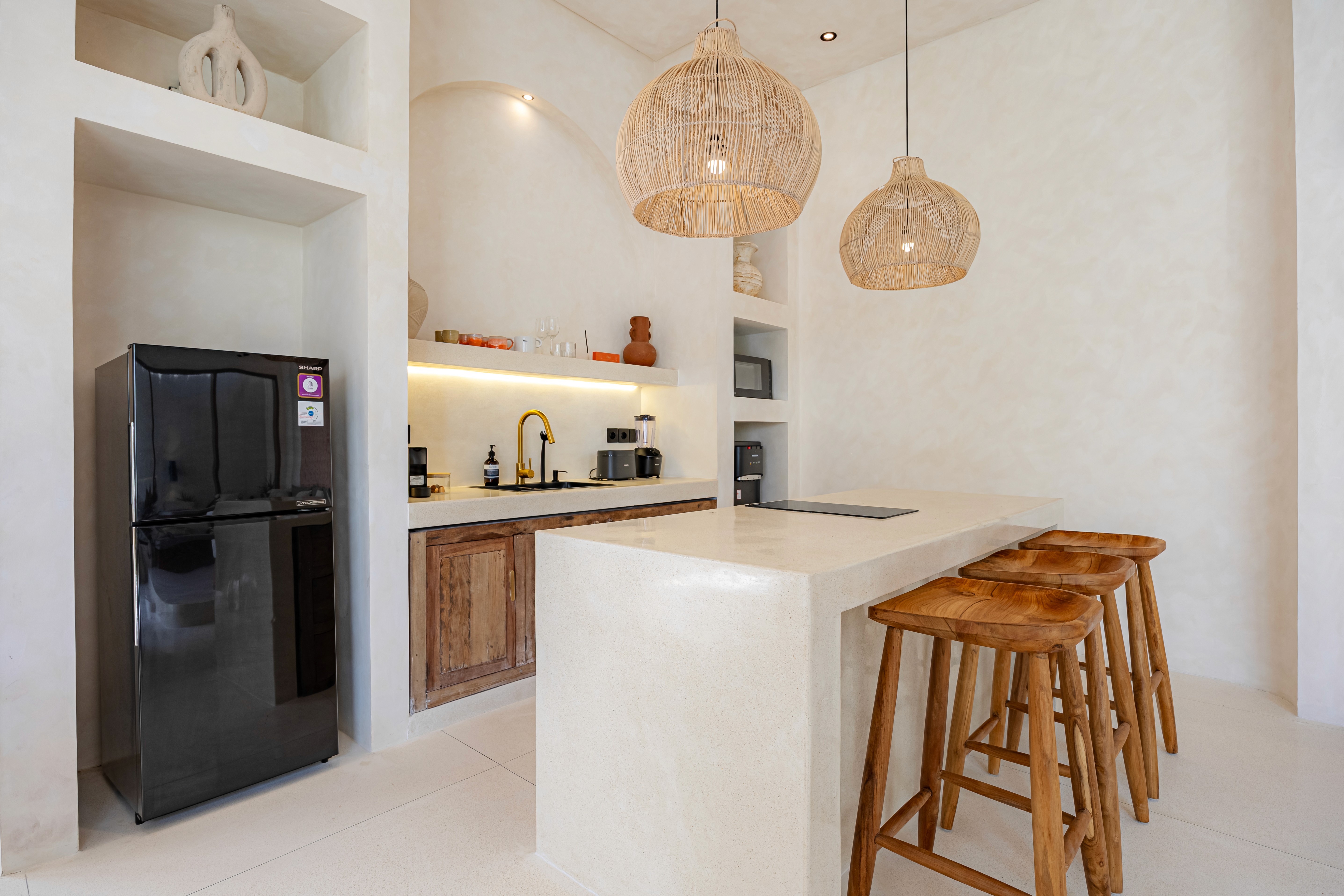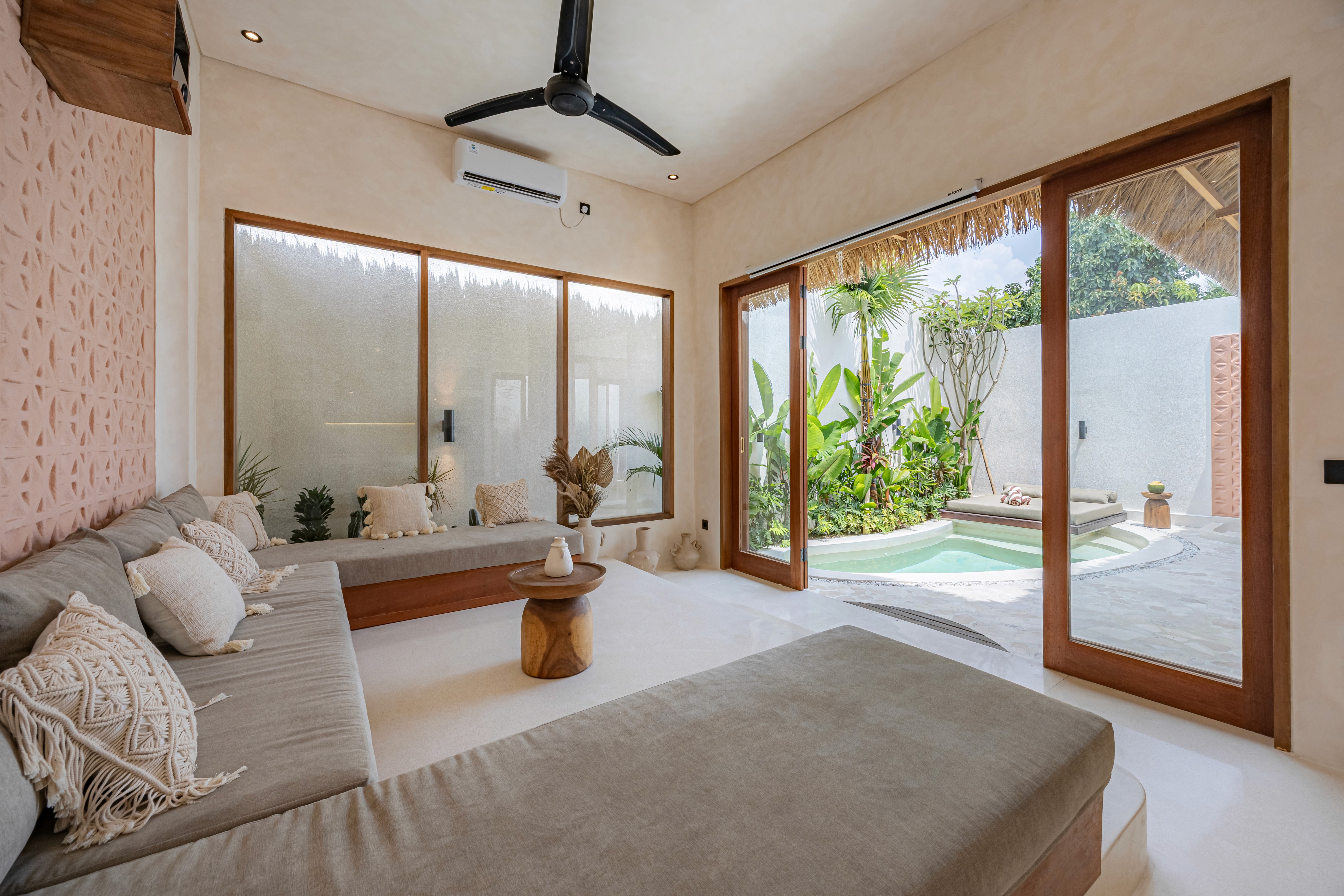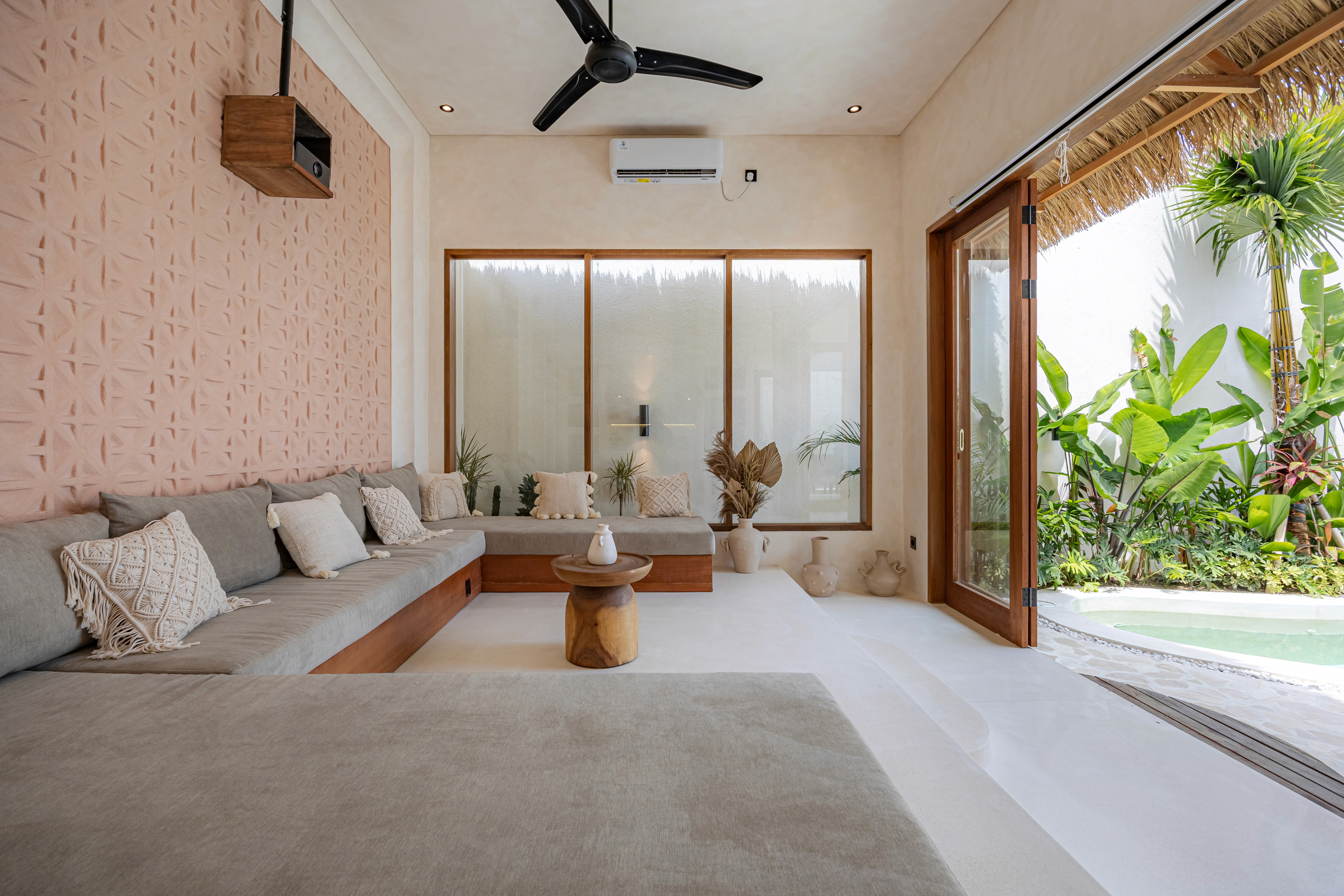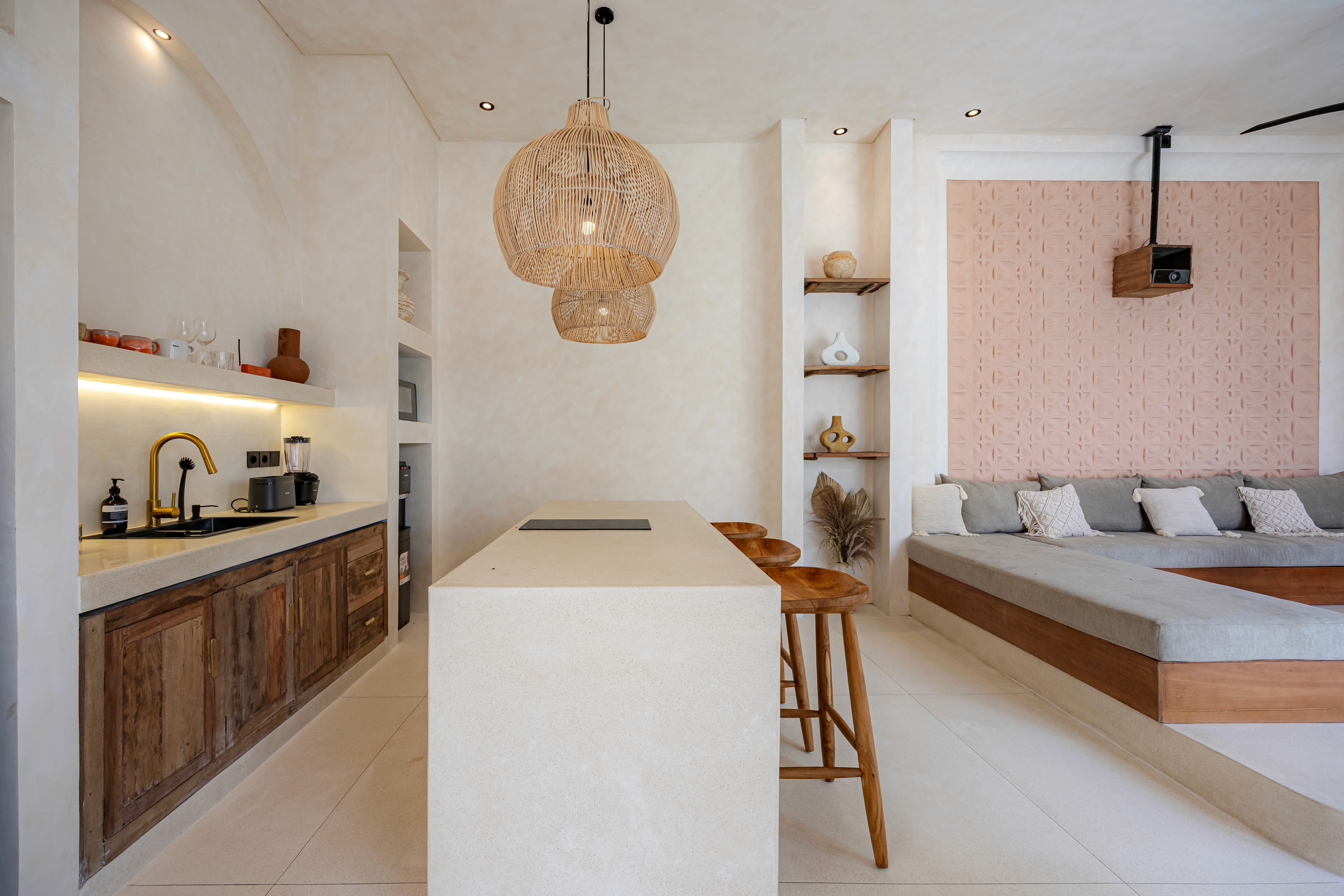 Inside, the bright living area is air-conditioned and designed for slow mornings or quiet evenings. You’ll find a comfortable sofa, smart TV, and a kitchen equipped with all essentials for in-villa dining.