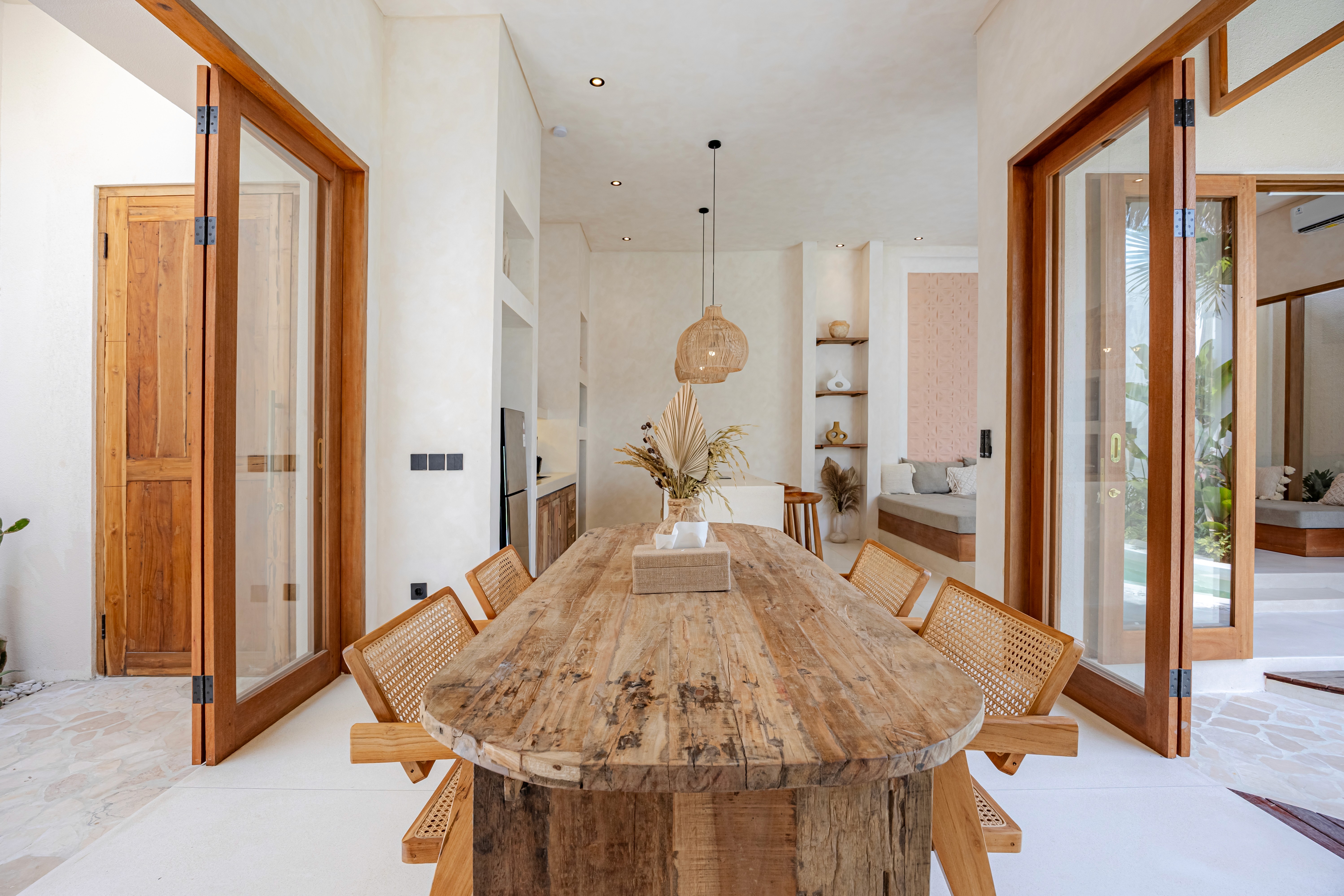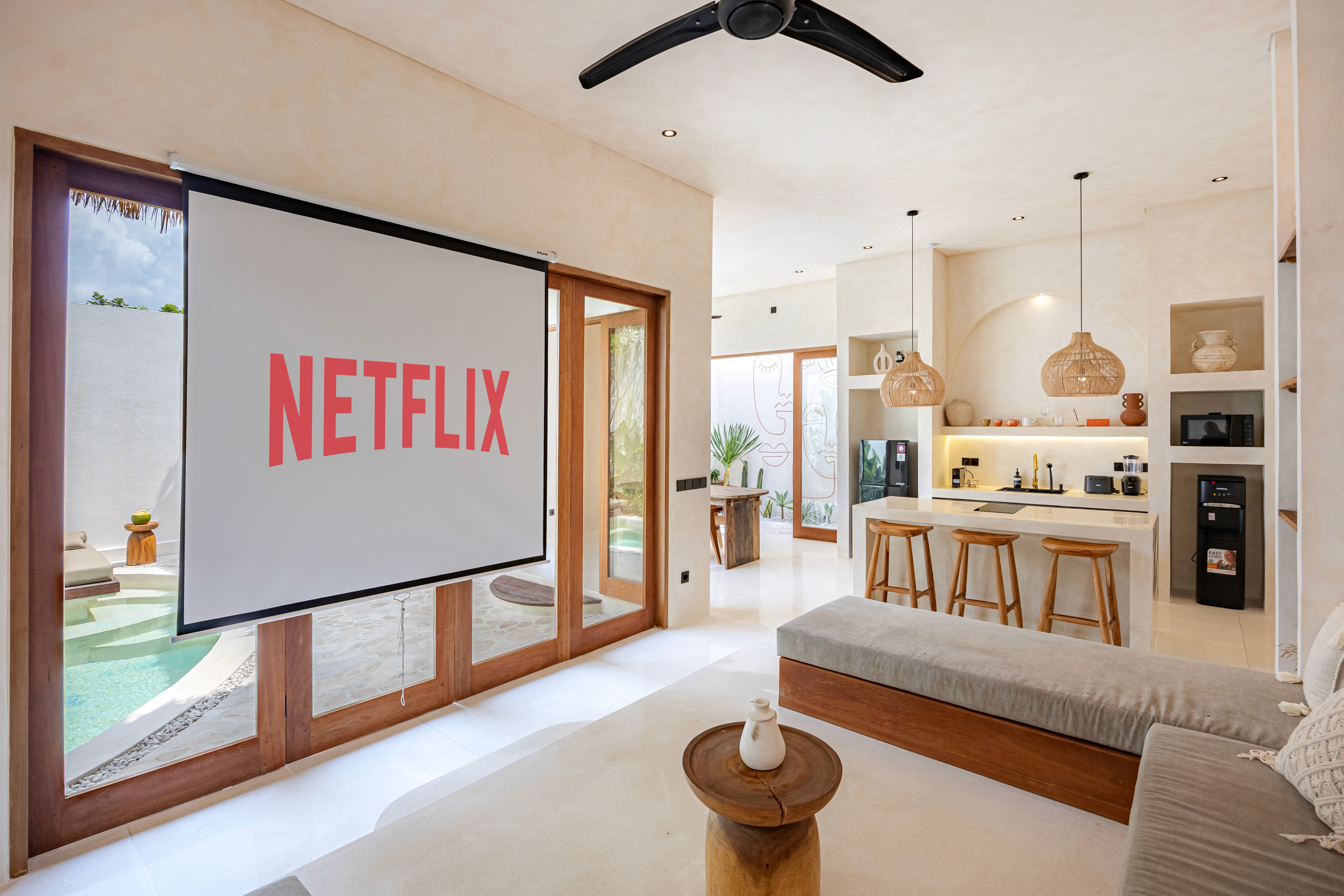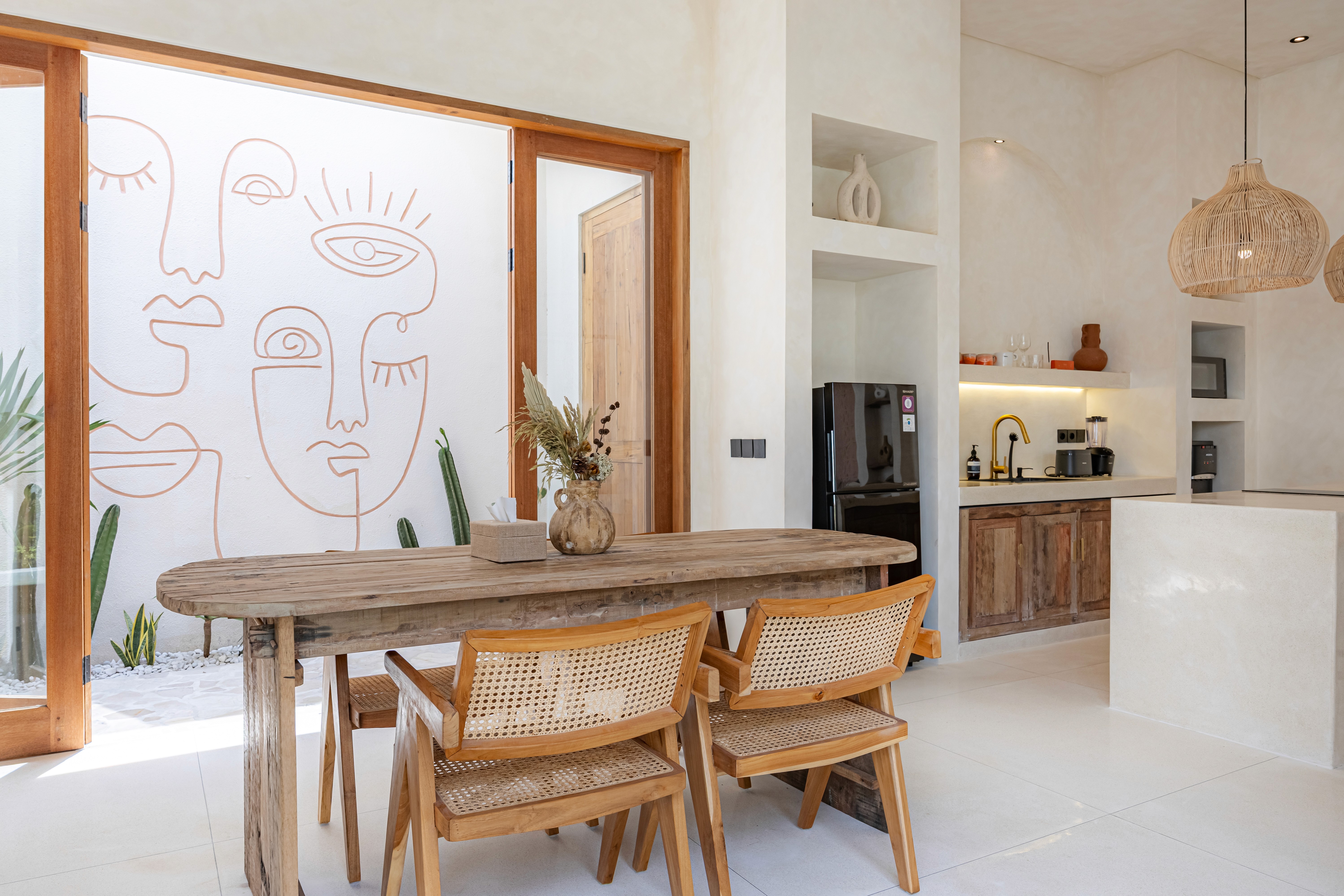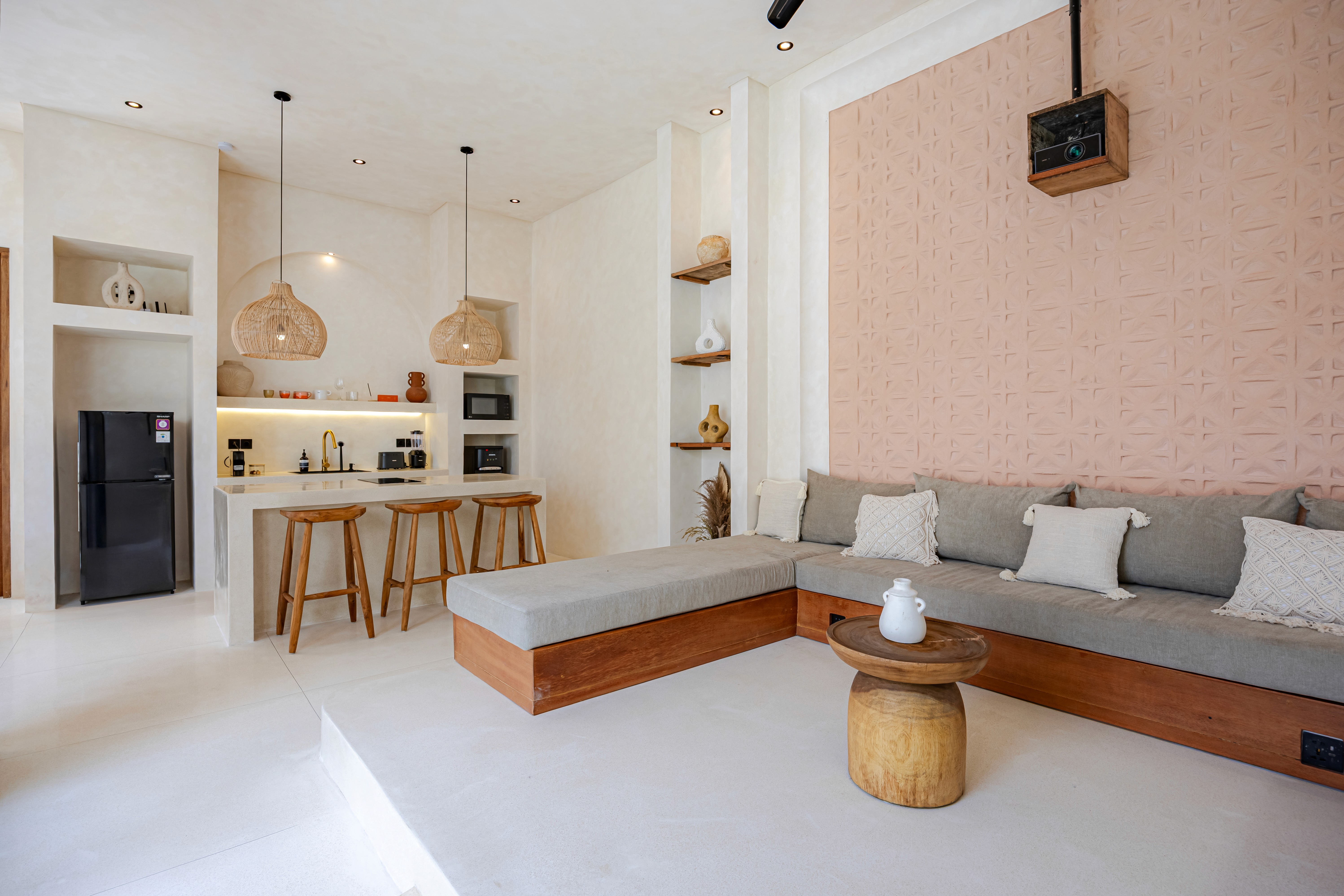 Inside, the bright living area is air-conditioned and designed for slow mornings or quiet evenings. You’ll find a comfortable sofa, smart TV, and a kitchen equipped with all essentials for in-villa dining.
