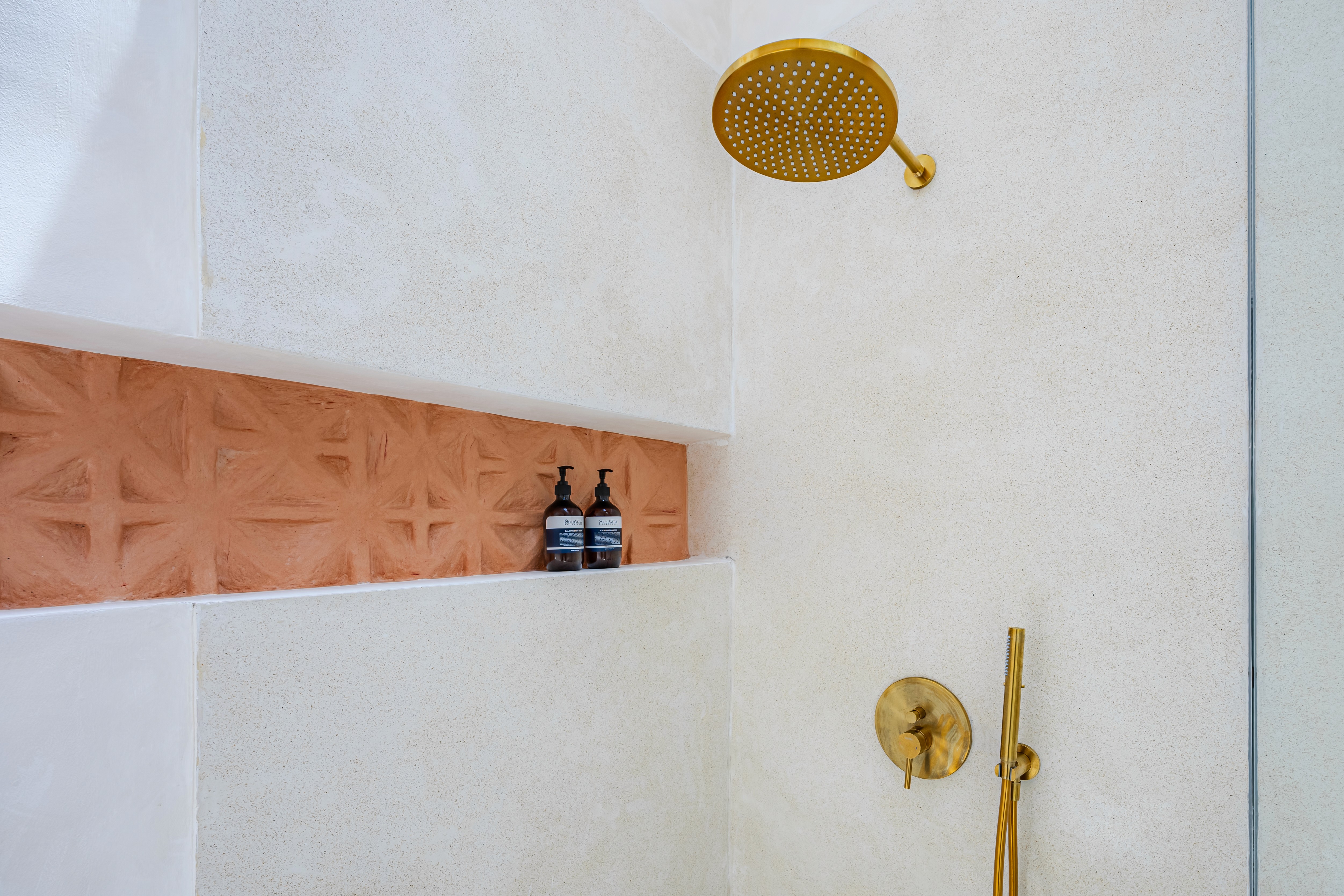 The bedroom features plush bedding, calming décor, and soft natural light, while the ensuite bathroom offers a refreshing rain shower and warm-water amenities.